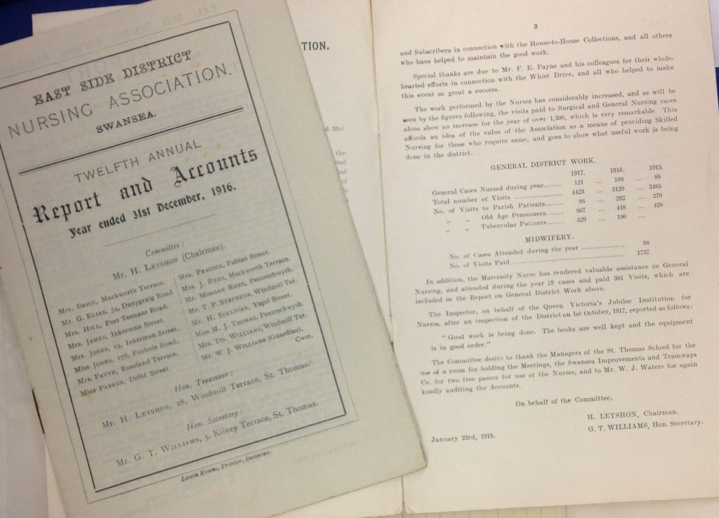 Nursing Associations– records of East Side District Nursing Association (Ref. LAC/64/7) detail the increasing ‘useful work’ of district nurses, before the time of statutory provision for district nursing (which didn’t come until 1948). These Associations supported an alternative nursing service to expensive private home nursing. This 1916 report also details the ‘valuable assistance’ of Nurse Morris, the first Maternity Nurse in Swansea’s Eastside.