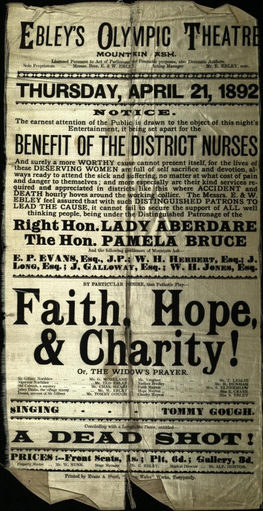 This 1892 silk playbill by Ebley Portable Theatre highlights the important role played by district nurses in a pre-NHS South Wales Coalfield. It promotes a benefit performance for district nurses- ‘deserving women…full of self-sacrifice and devotion’.