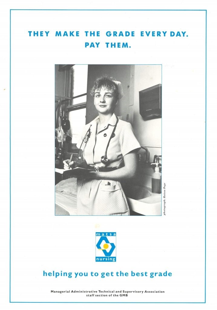 This poster uses a Raissa Page image taken at Hackney Homerton Hospital. It was published for a nursing pay/grading campaign by Managerial Administrative Technical and Supervisory Association, staff section of the GMB union in 1988.