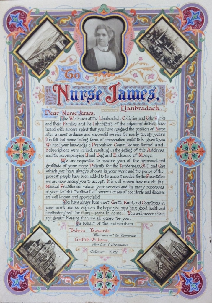 South Wales Coalfield– On her resignation in 1922, after almost 20 years service, the workmen at Llanbradach Collieries and Coke Works presenting ‘Nurse James’ with this beautiful ‘lasting form of appreciation’, expressing gratitude for her ‘Tenderness, Skill and Care’.