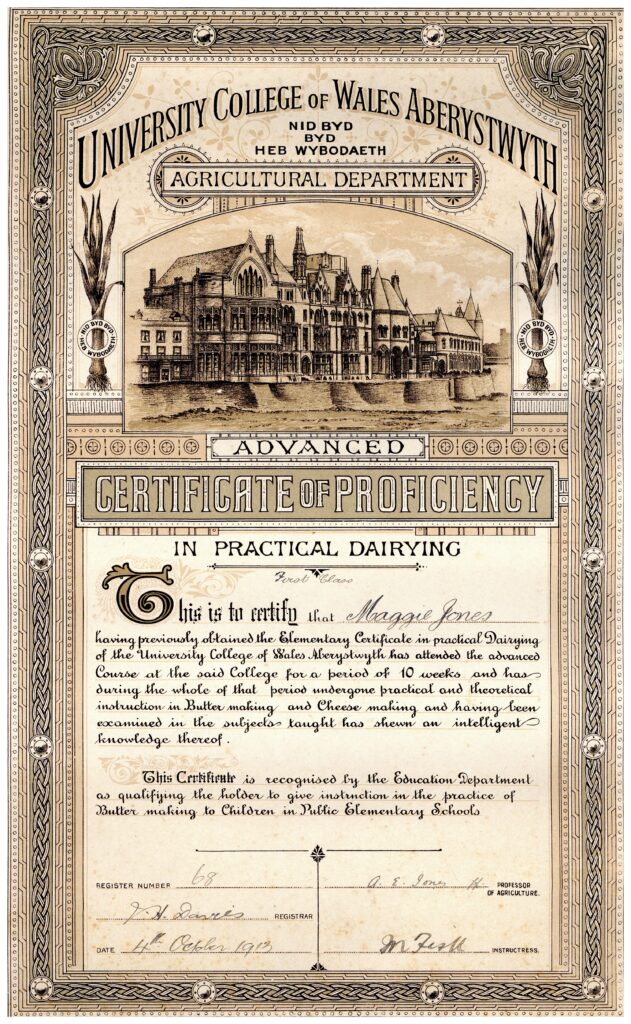 “So far, my (Bleddyn) favourite item that I have come across has been a diploma from Aberystwyth University in dairy-making from 1913! It was awarded to a young woman named Maggie Jones, who received a first-class qualification for completing a ten-week course in dairy-making. I found this fascinating, as I (like many of our volunteers), will go on to study at Aberystwyth, therefore it is an interesting little insight into the types of courses they offered at Aberystwyth in 1913. We also hold Maggie’s 1913 recipe book for cheese recipes and a photo of her class, which gives a fascinating little insight into what life was like as a student from rural Wales, at the start of the twentieth century”.