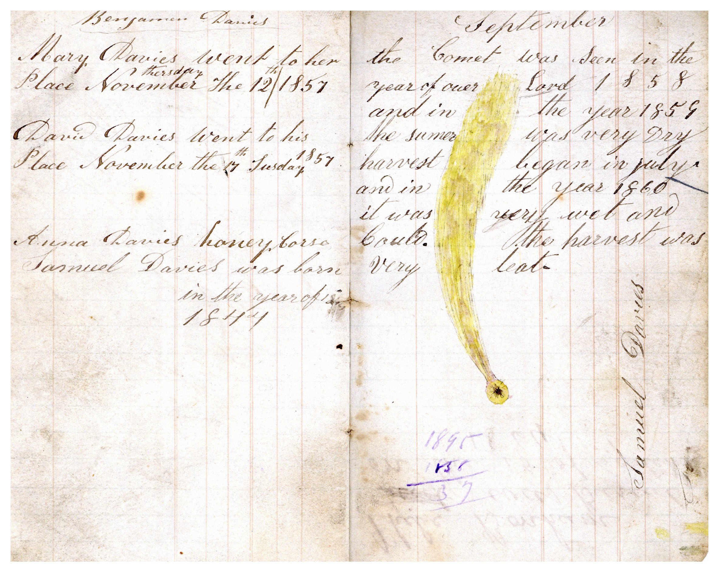 “For me (Emma,) the item that I remember the fondest was the food inventory turned-diary in an old notebook. As I was reading it, I noticed that the owner had drawn a small picture of a comet and written a little about it. Using the context clues and other dates left in the diary, I came to the conclusion that the comet was likely Comet Donati, the first comet ever photographed, drawn in this inconspicuous notebook.”