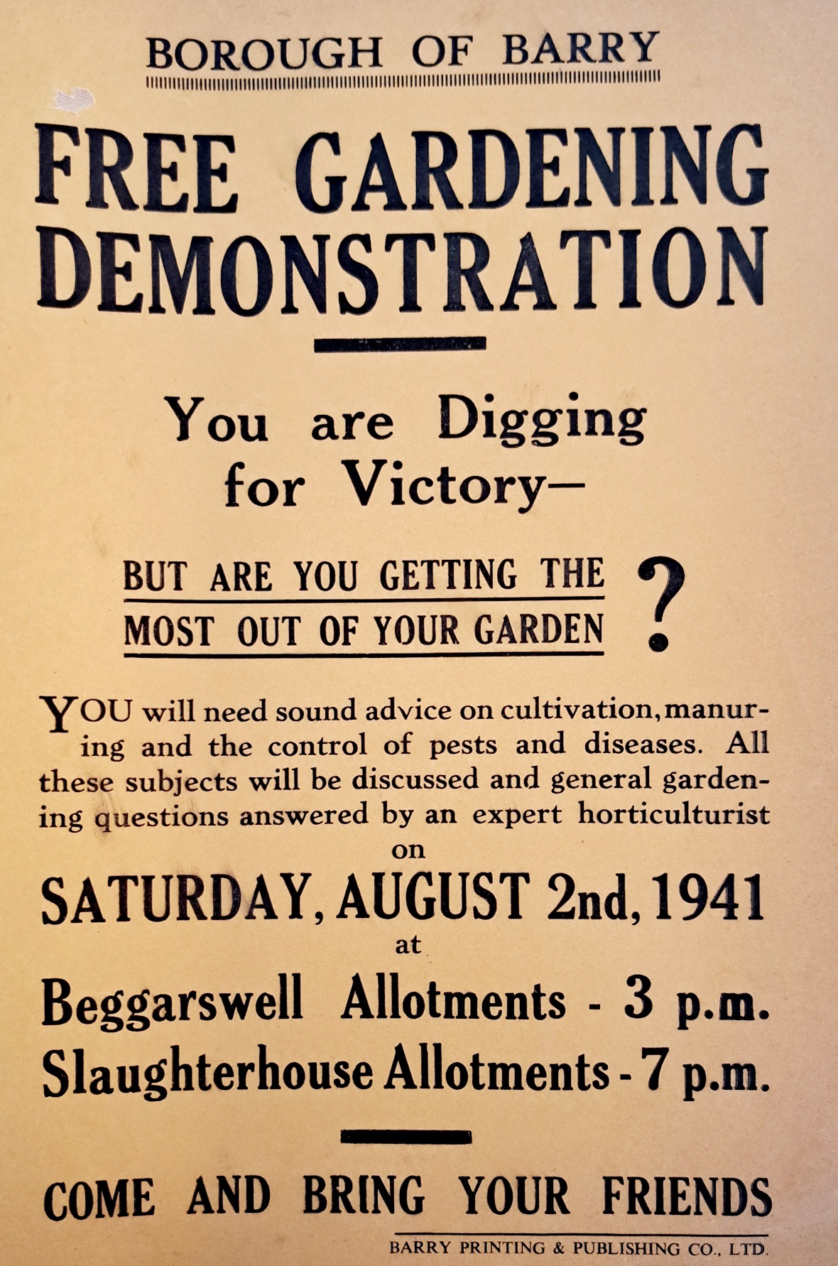 A poster advertising free gardening demonstrations and “questions answered by an expert horticulturalist”, 1941. Item from Glamorgan Archives.