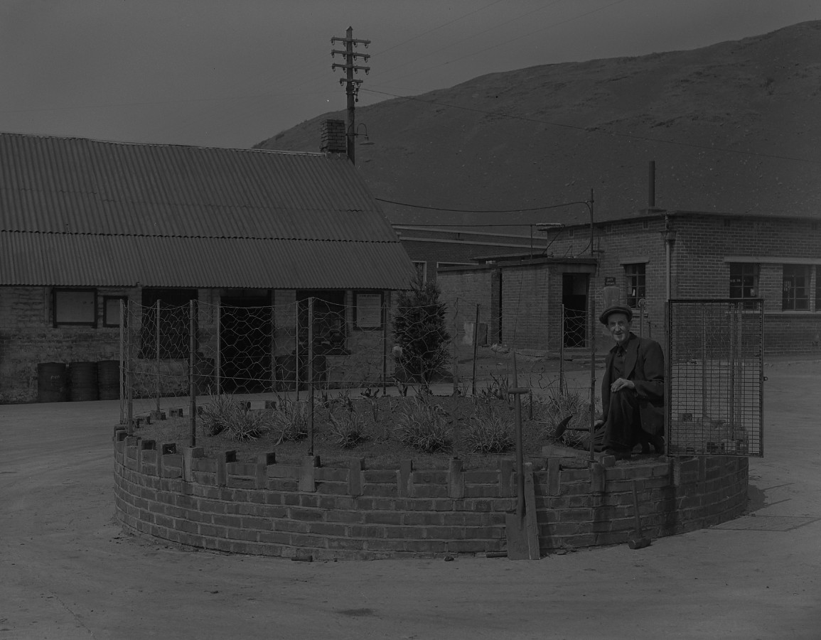 Collier working in a garden at the surface of Caerau Colliery, near Maesteg, 2 June 1954. Item from the National Coal Board collection at Glamorgan Archives.