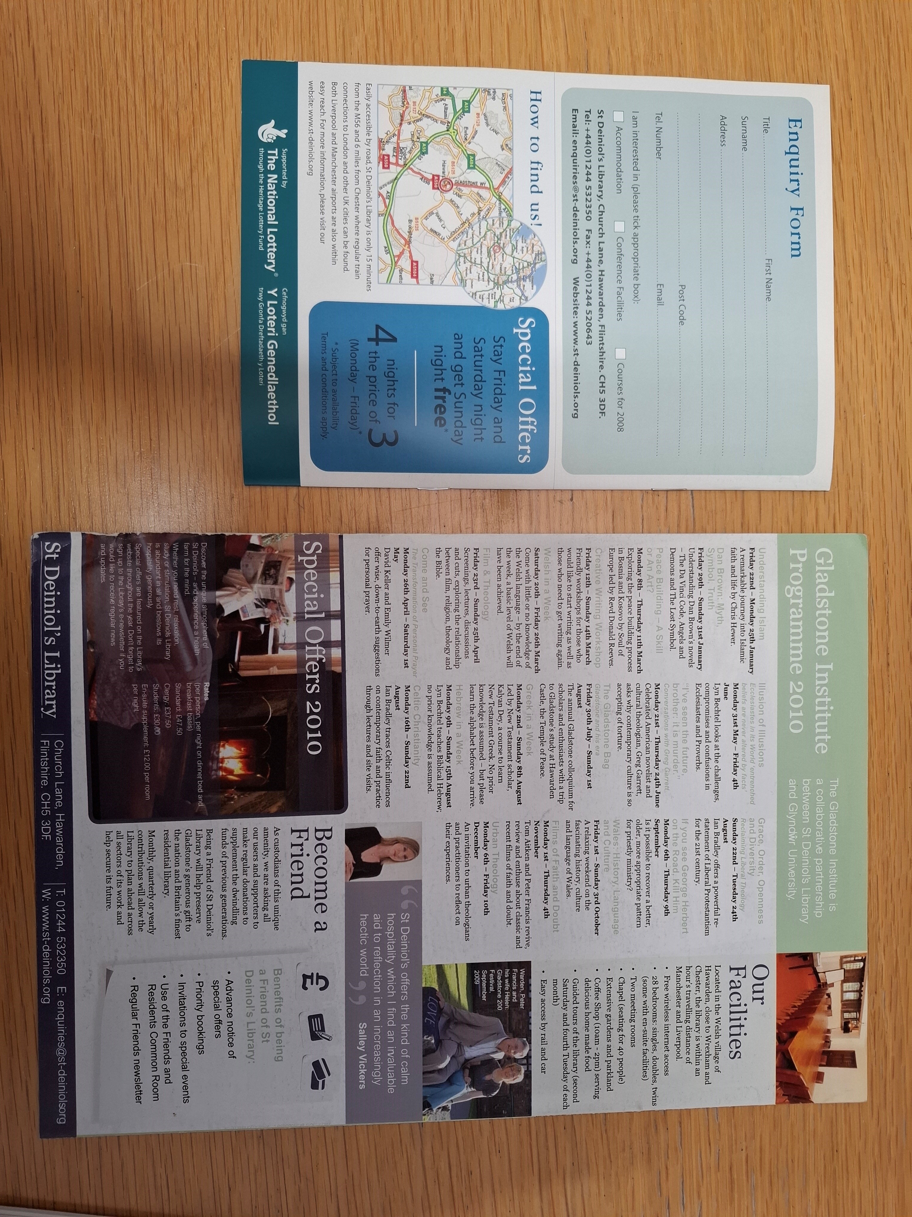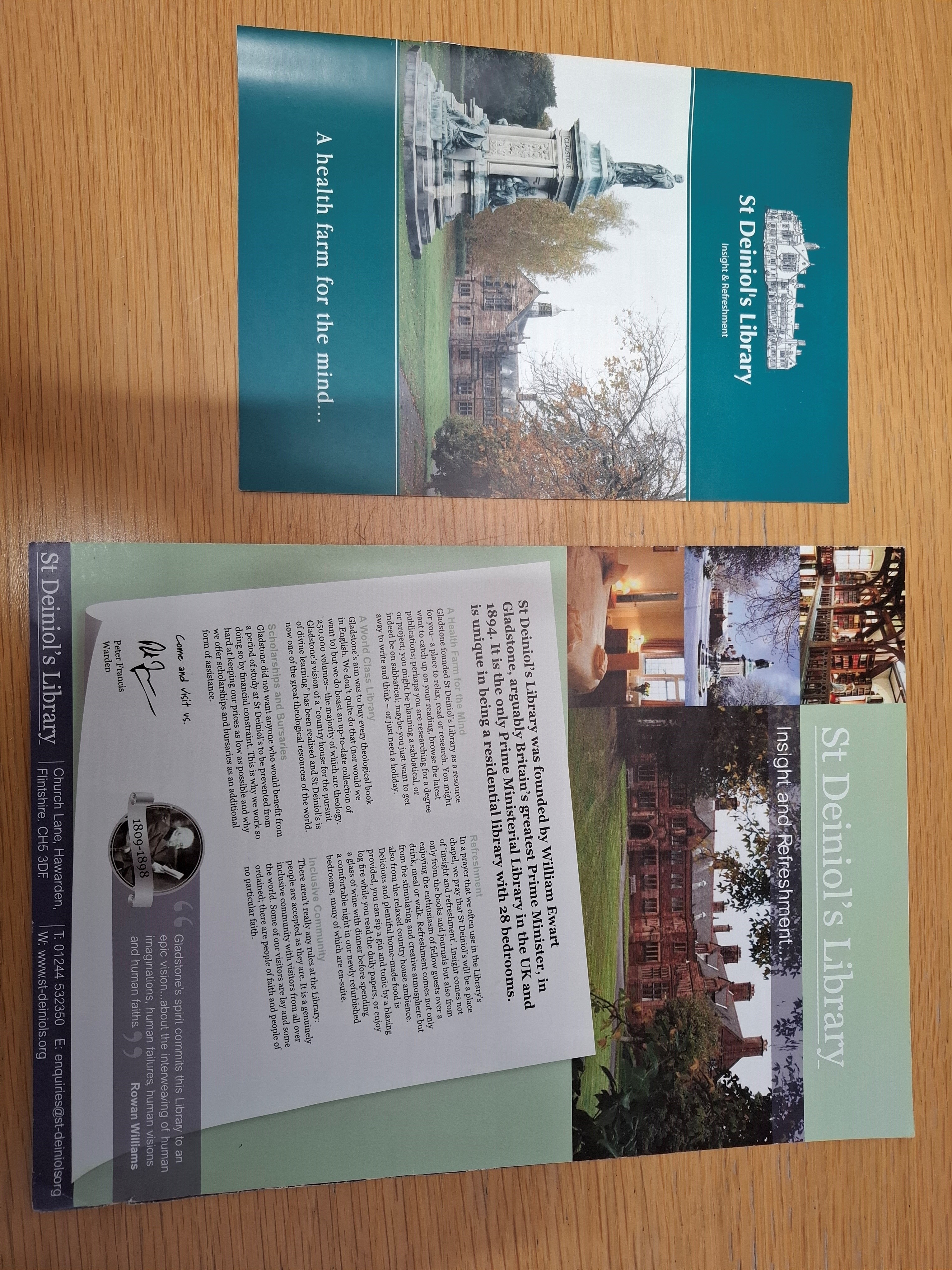 Advertising leaflets for St. Deiniol’s Library (2008 & 2010), items from Gladstone’s Library: