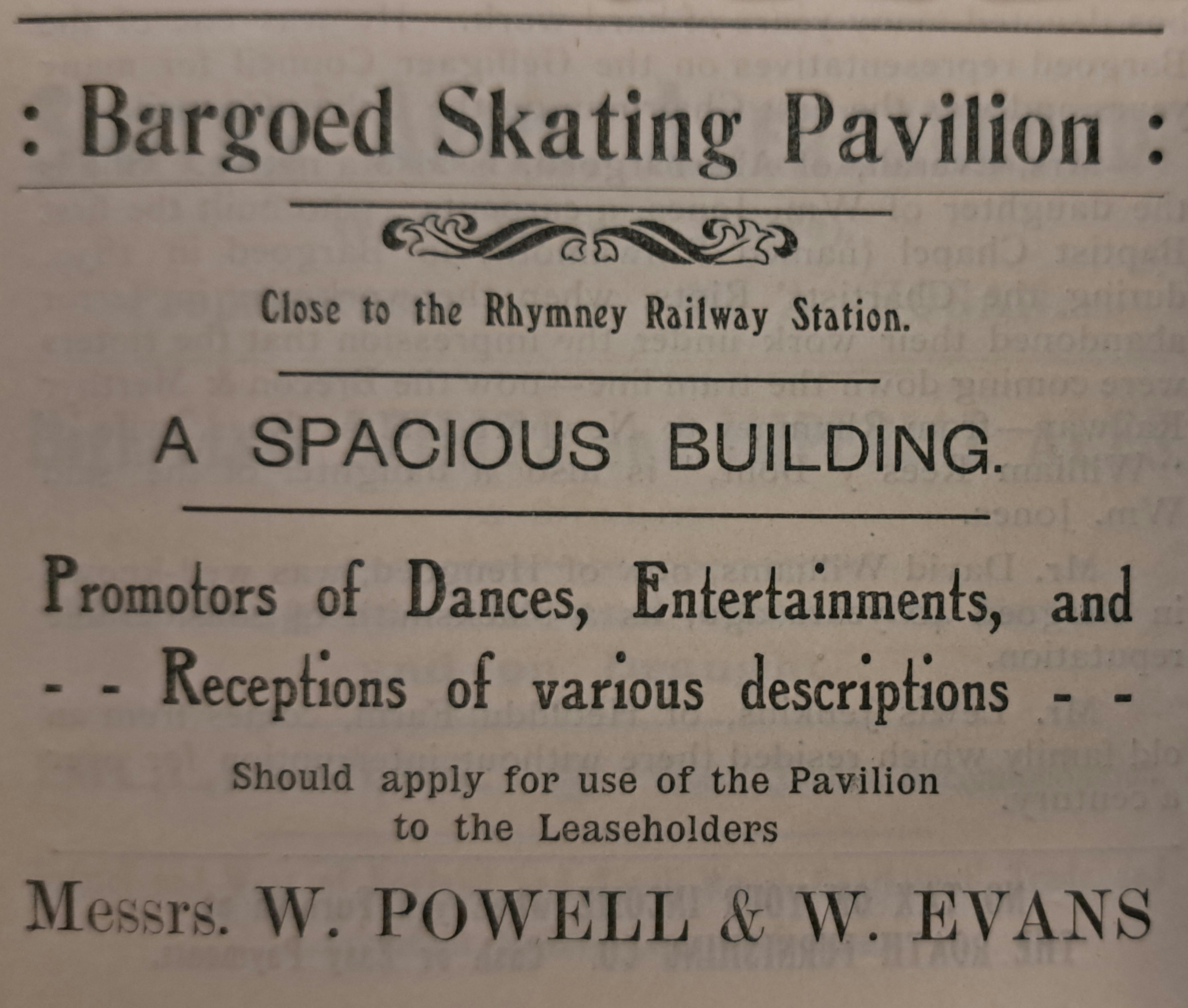 Fast forward to 1912, and we arrive at the Bargoed Skating Pavilion. Despite its name, the venue hosted far more than skating. The most striking part of the advertisement proudly declares it as “A SPACIOUS BUILDING” — perhaps to emphasize the grand scale of the space, a point of pride for the owners maybe.