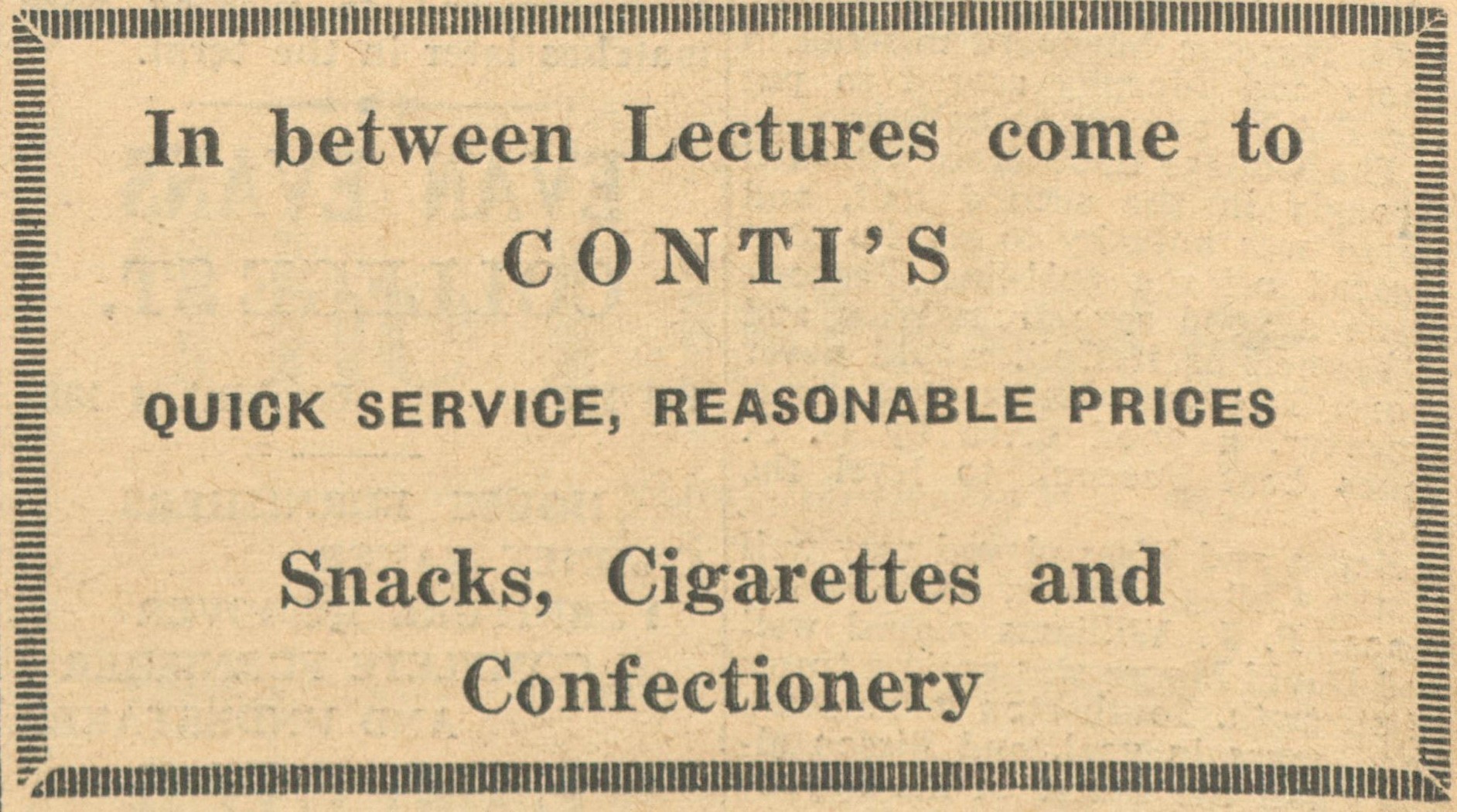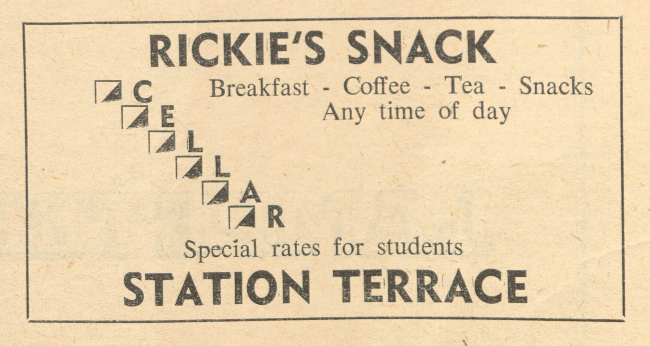 Next, we travel to 1960s Lampeter, where the college magazine, “The Gownsman”, features a cluster of local adverts. Rickie’s Snack Cellar offers “special rates for students,” while Conti’s invites students to visit between lectures. The Conti’s advert even promotes cigarettes – now a relic of a different era and something that would be illegal today. Then there’s the Black Lion Royal, with its cheeky slogan: “Don’t be slack, use The Black.” These snippets of student life give us a glimpse of how much (and how little) campus culture has changed.